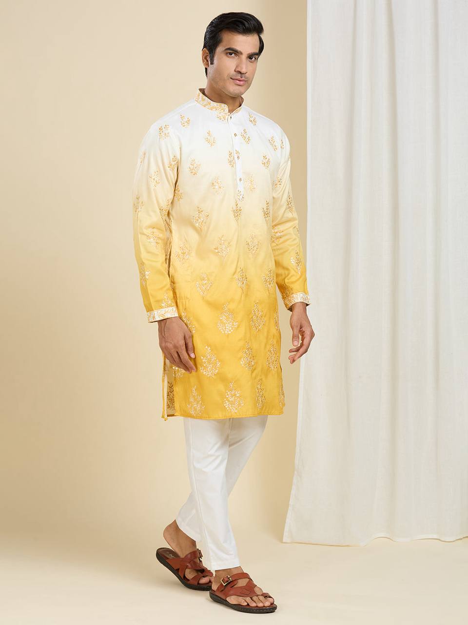 YELLOW & WHITE PRINTED WORK KURTA, PAJAMA AND DUPATTA SET FOR MEN'S