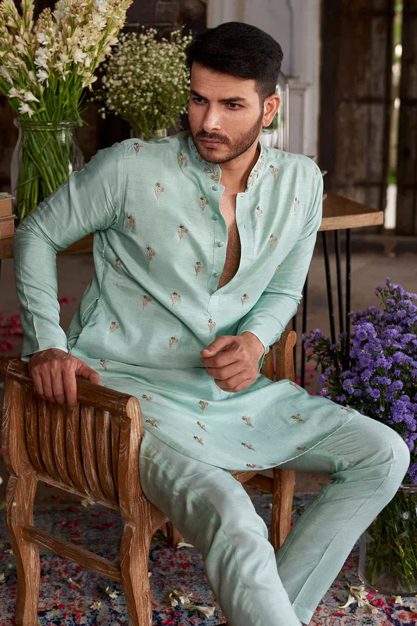 Baby Blue straight kurta with floral motif embroidery. Comes with pants.